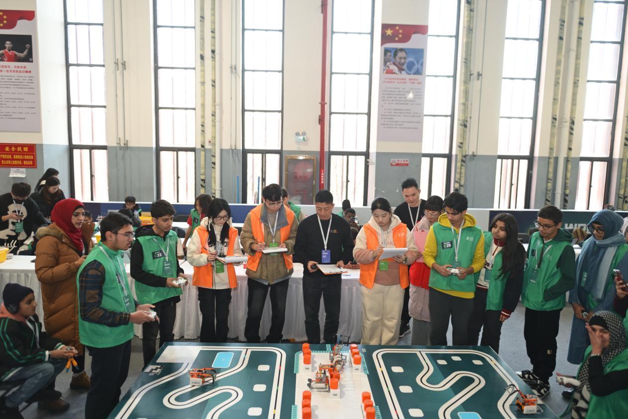 比赛现场,外籍选手与国内选手同台竞技,精准操控着手中的机器人,灵巧地将一块块“密匙能量方块”搬运至指定位置,并拼接成预设的图案。